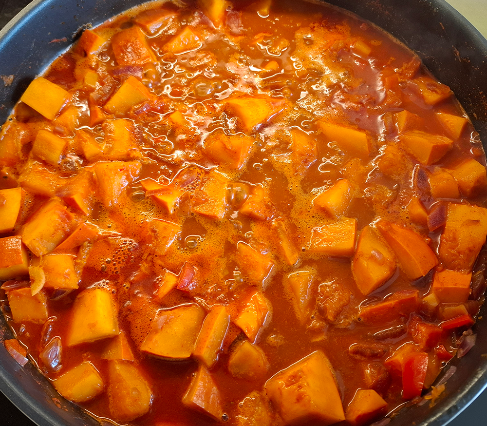 Für das Kürbisgulasch Zwiebel, Knoblauch und Paprika fein gewürfelt in Olivenöl goldbraun rösten, den Kürbis dazugeben und etwas weiterrösten, mit Paprikapulver stauben, Weißwein und etwas Suppe untergießen. Die Paprikasauce zugießen, mit Karotte und Zeller bissfest dünsten, ca. 5 Minuten. Mit gemahlenem Kümmel, Cayennepfeffer und Salz abschmecken