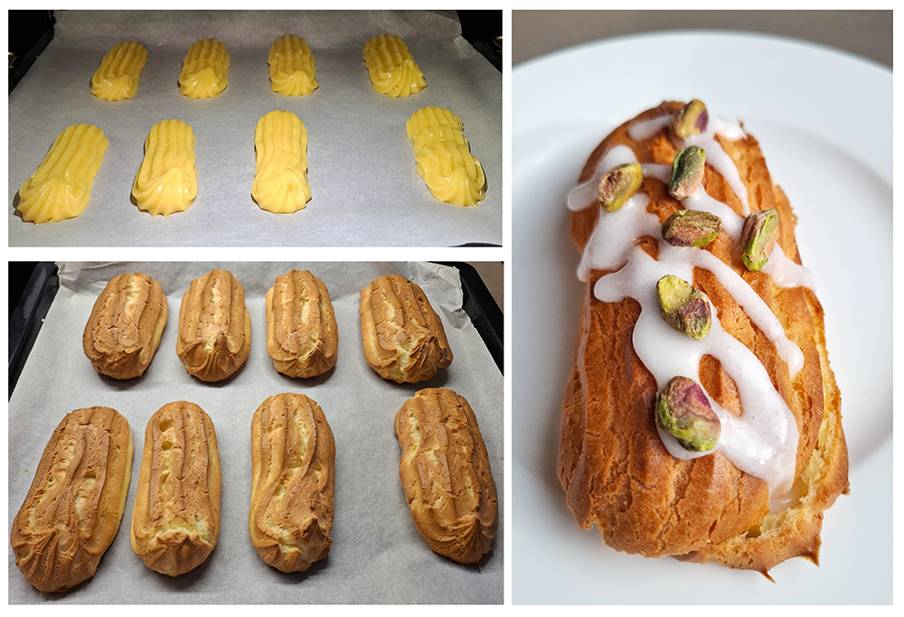 Wasser, Milch, Butter, Salz und Zucker aufkochen, dann das Mehl in einem Schwung in die Flüssigkeit und so lange rühren, bis eine dicke Masse, ein richtig geschmeidiger Teig, entsteht und sich am Boden so eine milchige Schicht bildet. Dann nach und nach die Eier unterrühren (mit dem Handmixer), immer dazwischen kontrollieren, das es nicht zu viele eier sind und der Teig zu dünn wird.