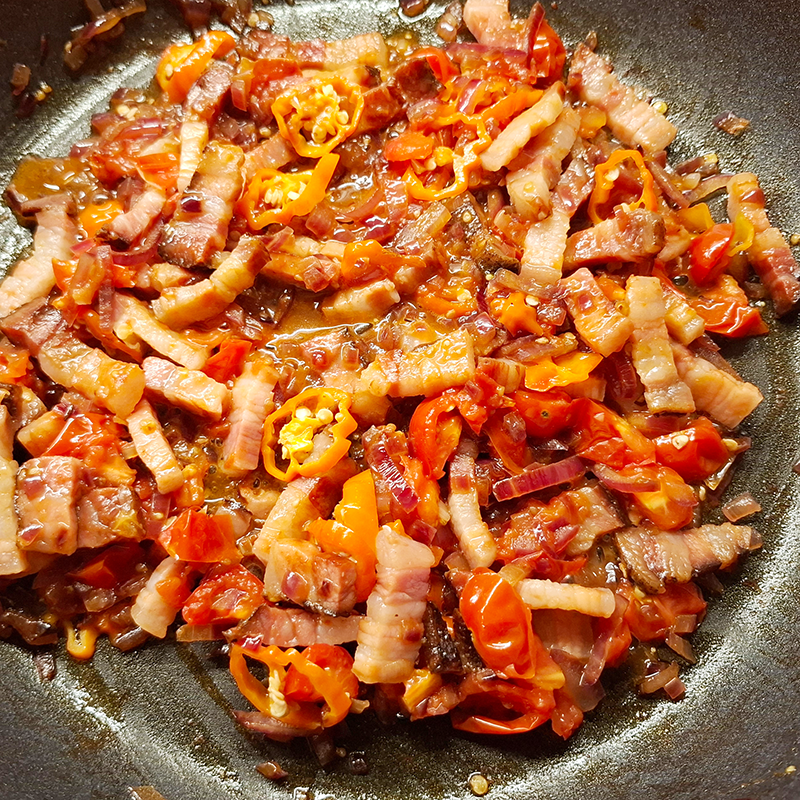Paradeiser würfeln, chili entkernen und ebenfalls klein würfeln, in die Pfanne geben und köcheln lassen bis die Paradeiser sämig werden und ihren Geschmack gut entfalten - das dauert ein wenig.